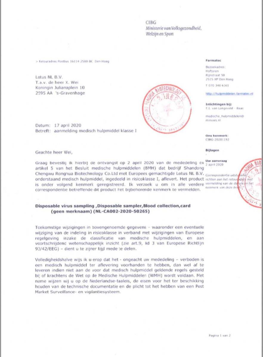 1. 我公司新冠病毒檢測采樣試劑盒完成CIBG荷蘭注冊我公司新冠病毒檢測采樣試劑盒完成CIBG荷蘭注冊